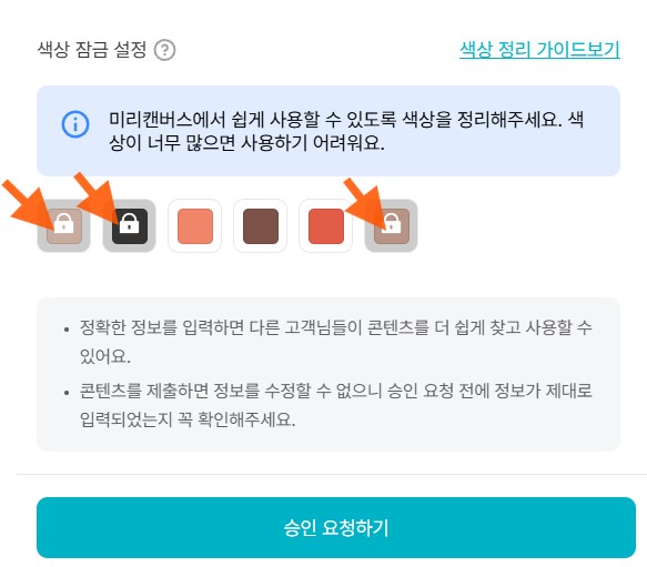 일러스트레이터로 SVG 파일로 저장했다면, 그림을 그리면서 사용된 칼라들이 팔레트로 표기가 되게 되는데, 이 팔레트는 미리캔버스 사용자들이 내 그림을 사용할 때 열어놓은 팔레트의 색을 수정해서 변경할 수 있습니다. 다만 사용자들이 쉽게 변경할 수 있도록, 변경할 수 있는 색을 제외한 나머지 색은 클릭을 해 잠그기 설정을 해주셔야 합니다. 내 그림에 색이 많이 사용되었다면, 최대 4~5개 정도까지의 색상만 변경할 수 있도록 해주시고 나머지는 잠그기 설정을 해주시는 것이 좋습니다. 참조로, PNG 파일을 업로드 할 때에는, 색상잠그기 설정 내용이 나오지 않습니다.