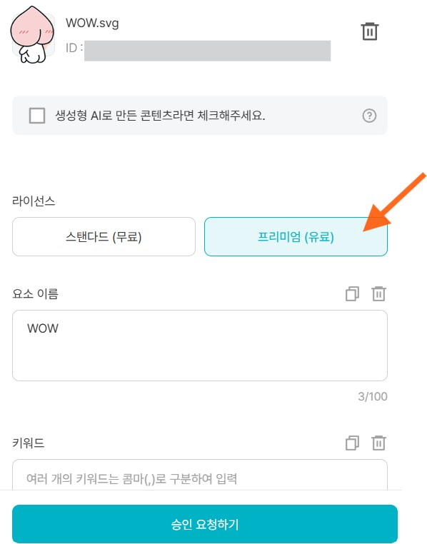 파일을 선택하게 되면 콘텐츠업로드 페이지에 내가 올린 파일이 뜨게 되는데, 내 그림을 클릭하면 오른쪽에 요소에 대한 추가적인 정보를 입력할 수 있는 칸이 생깁니다.